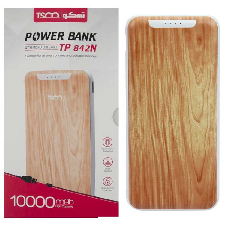 شارژر همراه تسکو مدل TP 842N ظرفیت 10000 میلی آمپر ساعت یک پاوربانک بسیار قدرتمند با مشخصات فنی کامل و طراحی بسیار زیبا با طرح چوب است. در نگاه اول بدنه چوبی بهنظر میرسد ولی بدنه پلاستیکی بوده و طرح چوب است. در بالای پاوربانک یک قسمت سیاه رنگ وجود دارد که چهار LED برای نشاندادن میزان شارژ در آن کار گذاشتهشده است. شارژر همراه تسکو مدل TP 842N ظرفیت 10000 میلی آمپر ساعت، میتواند مدت طولانی کاربر را از شارژ بینیاز سازد. در این پاوربانک ۴ درگاه از خانواده USB وجود دارد. ۲ عدد از آنها USB 2.0، یکی دیگر USB-C و دیگری microUSB هستند. USB-C و microUSB در این پاوربانک فقط برای شارژ شدن خود شارژر همراه با ولتاژ ۵ و آمپر ۲ است. ما با استفاده از این پاوربانک فقط میتوانیم از USB 2.0های با ولتاژ ۵ و آمپر ۲.۱ آن شارژ دریافت کنیم. شارژر همراه تسکو مدل TP 842N ظرفیت 10000 میلی آمپر ساعت دارای بدنهای مقاوم در برابر ضربه دارد. این پاور بانک بهدلیل وزن پایین و ابعاد جمعوجورش گزینهای مناسب برای حملونقلهای طولانی است. شارژر همراه تسکو مدل TP 842N دارای محافظت در برابر شارژ بیشازحد و ولتاژ بیشازحد است.